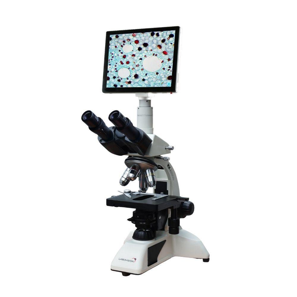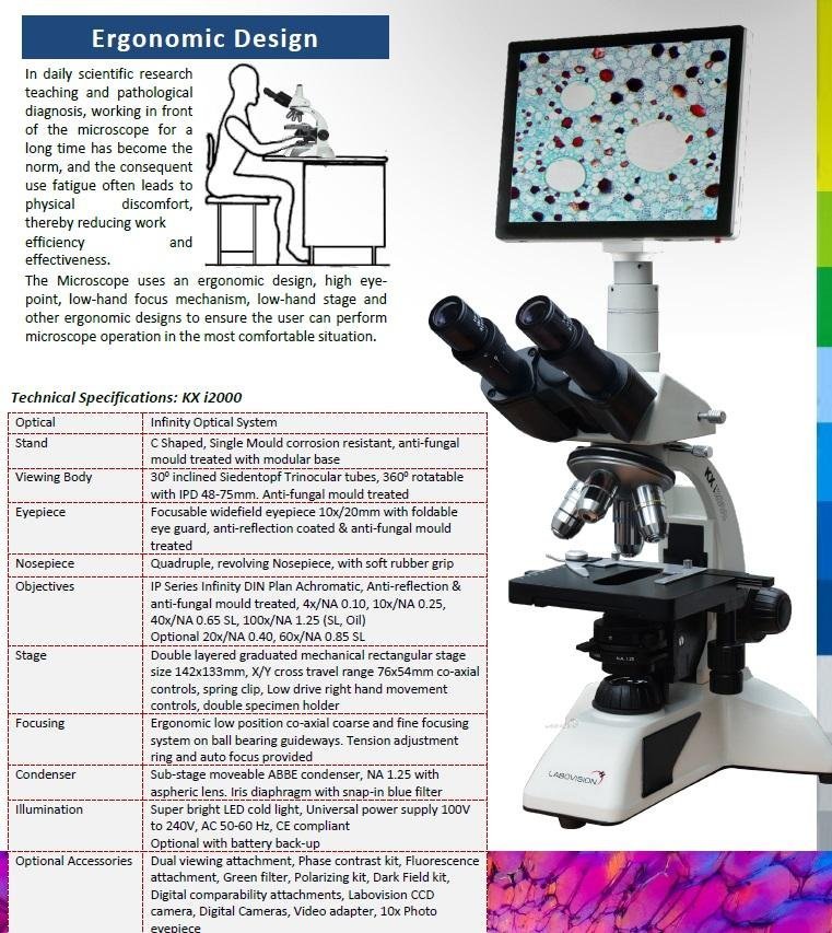 Trinocular Microscope supports premium optics that delivers crisp, bright, and consistent visualization. This routine microscope frame well fits the hands and the location of the control knobs maximizes ergonomics to improve work efficiency. Users can quickly set a specimen with one hand while adjusting the focus and operating the stage with the other hand with minimal movement. The microscope can be upgraded to a camera port for digital imaging. The microscope employs Full Plan Achromatic objectives, which provide clear images with high image flatness over a wide field of view. This helps users view specimens clearly and evenly during routine microscope observations.